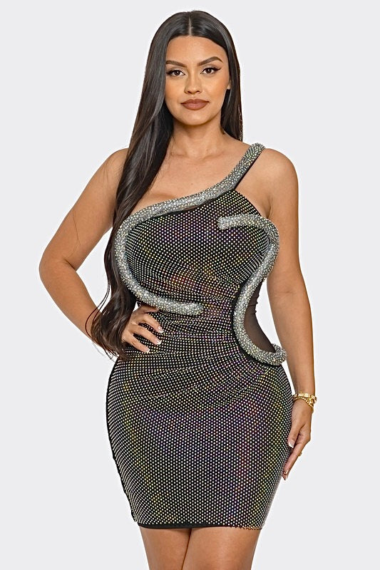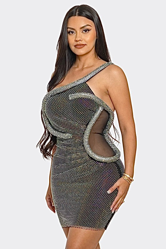 One Sleeve Mini Mesh Dress with snake wrap around crystal bling Detail.