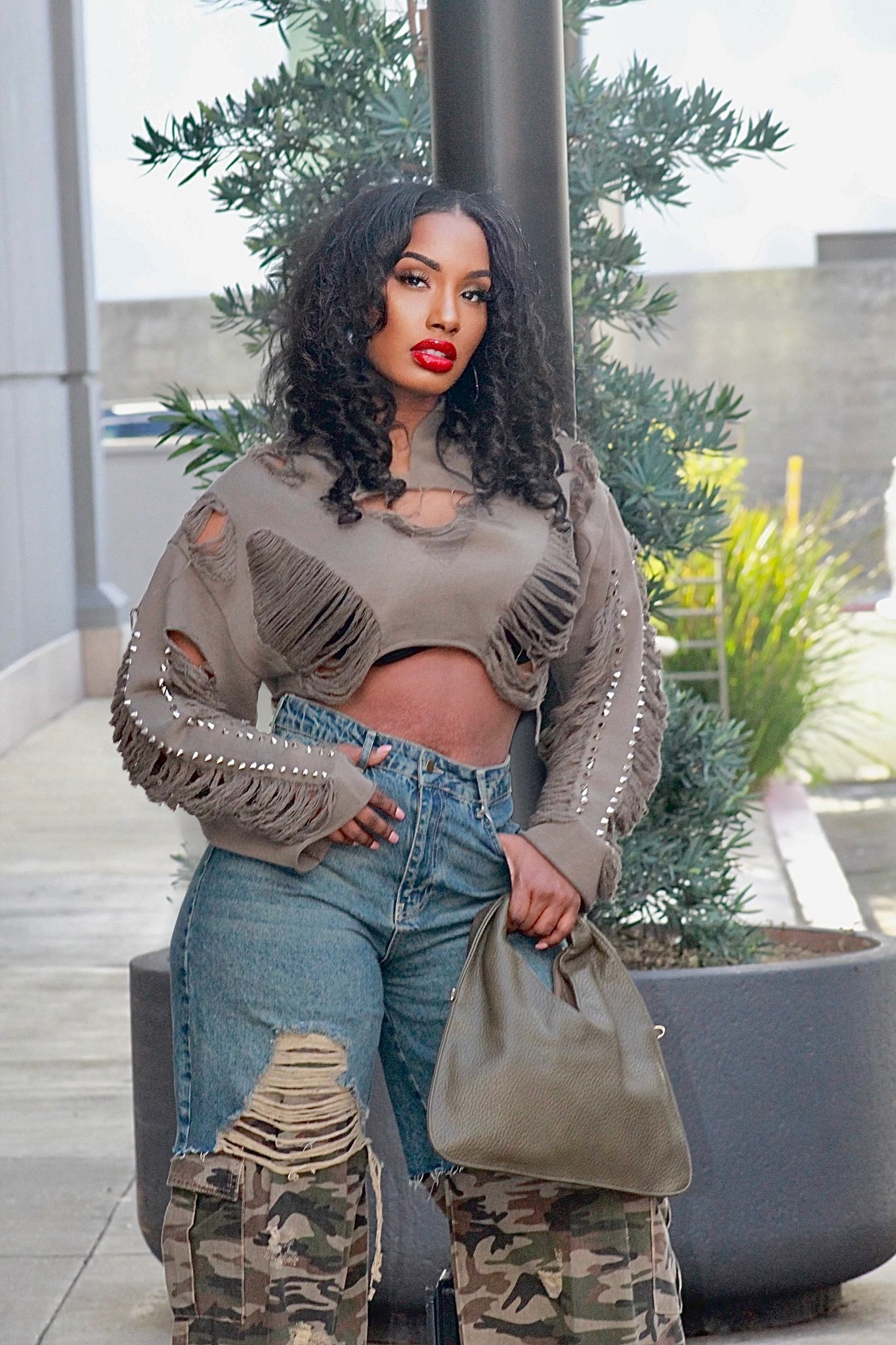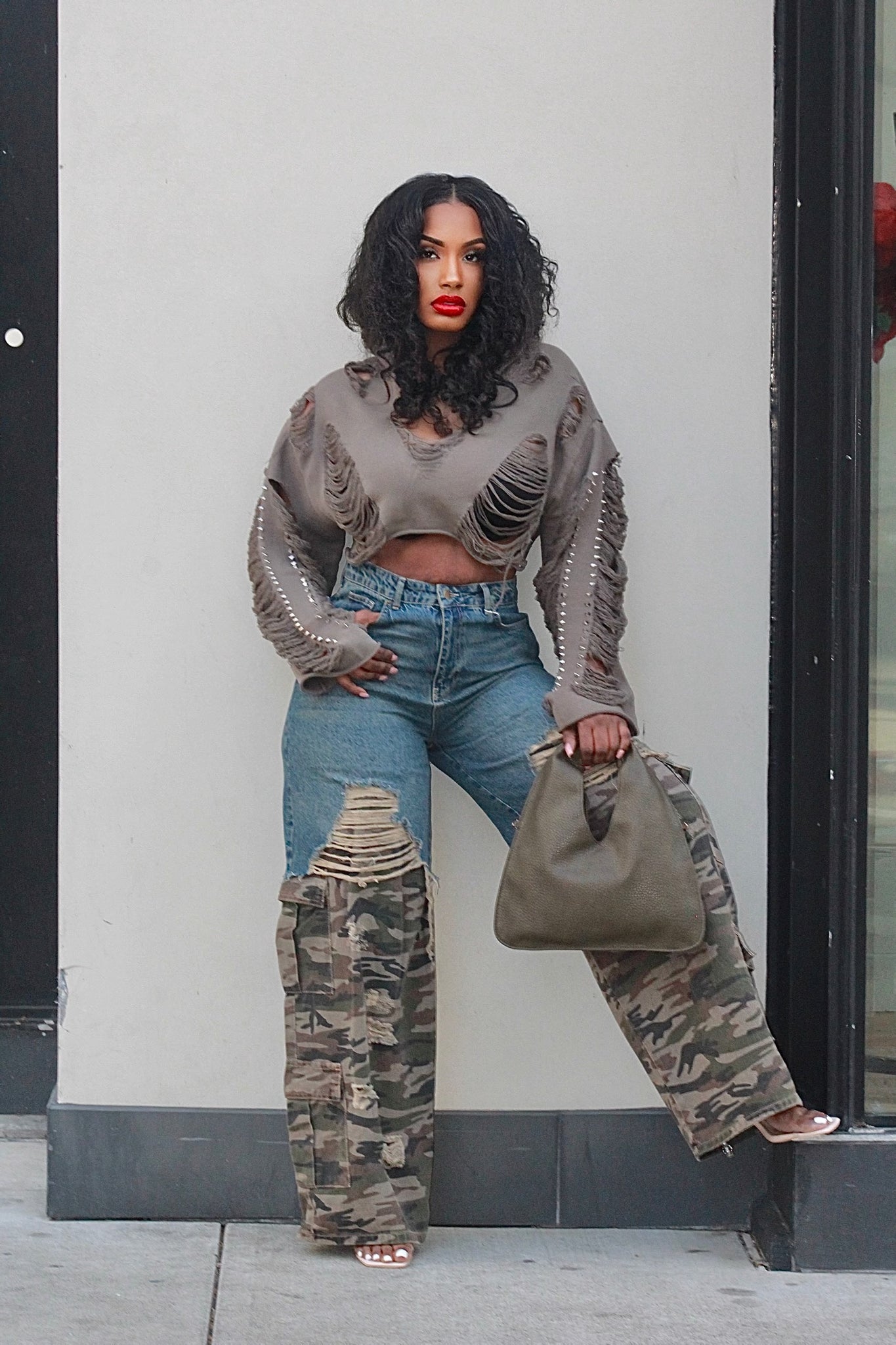 High Waist Denim Jeans with Distressed Detail and Camo Print Bottoms