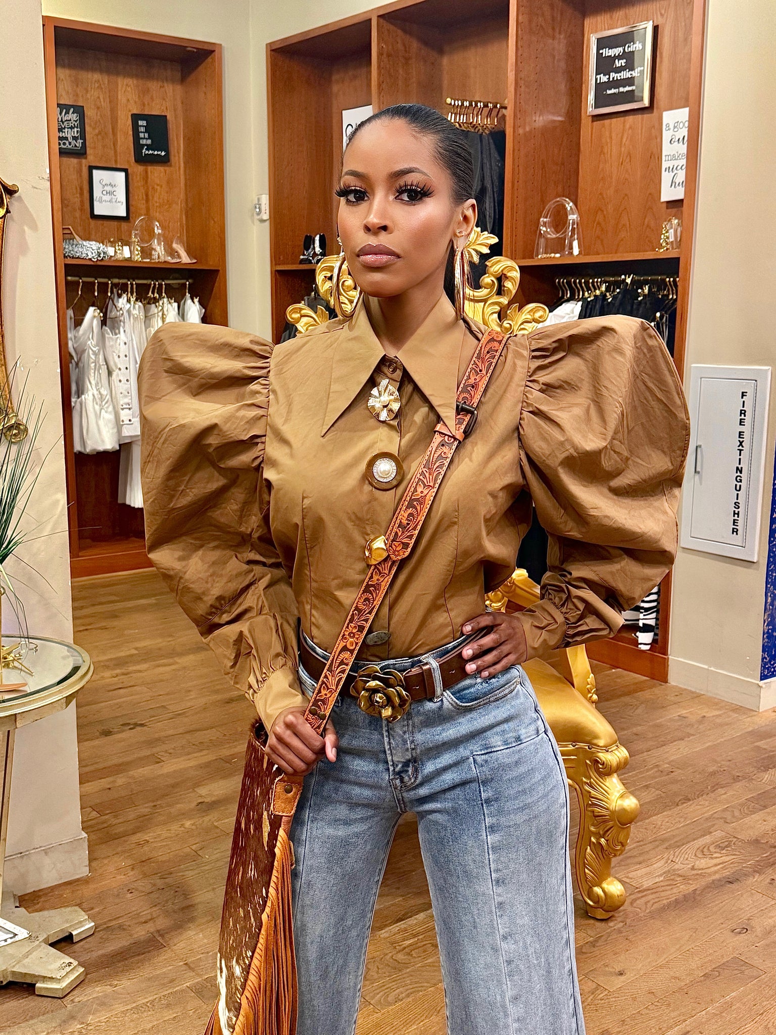 Exaggerated Puff Sleeve with Fitted Bodice. Decorative Stone Detail